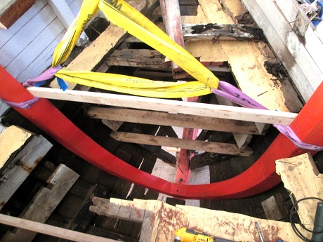 Les nouvelles membrures seront ensuite posées. Cette opération complexe a nécessité la fabrication et la mise en place d’un système de levage adapté au volume des pièces de charpente : un palan coulissant sur un câble d’acier traversant au-dessus du bateau permettant le levage et la pose des membrures.